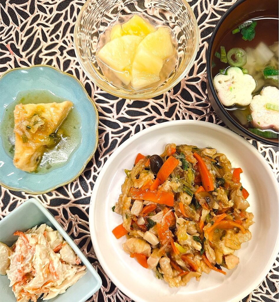 「本日の昼食」 投稿日 2025年9月20日 著者 ほっとキッチン カテゴリー お知らせ・ブログ 2025.9.20(土) 〈昼食〉○清汁○鶏肉と野菜のオイスターソース炒め○三角厚揚げのねぎあんかけ○ごぼうのマヨサラダ○パイン 本日の昼食は「鶏肉と野菜のオイスターソース炒め」です✨具材にしっかりソースの味がしみており美味しかったです😊きのこもたっぷりはいっていました◎