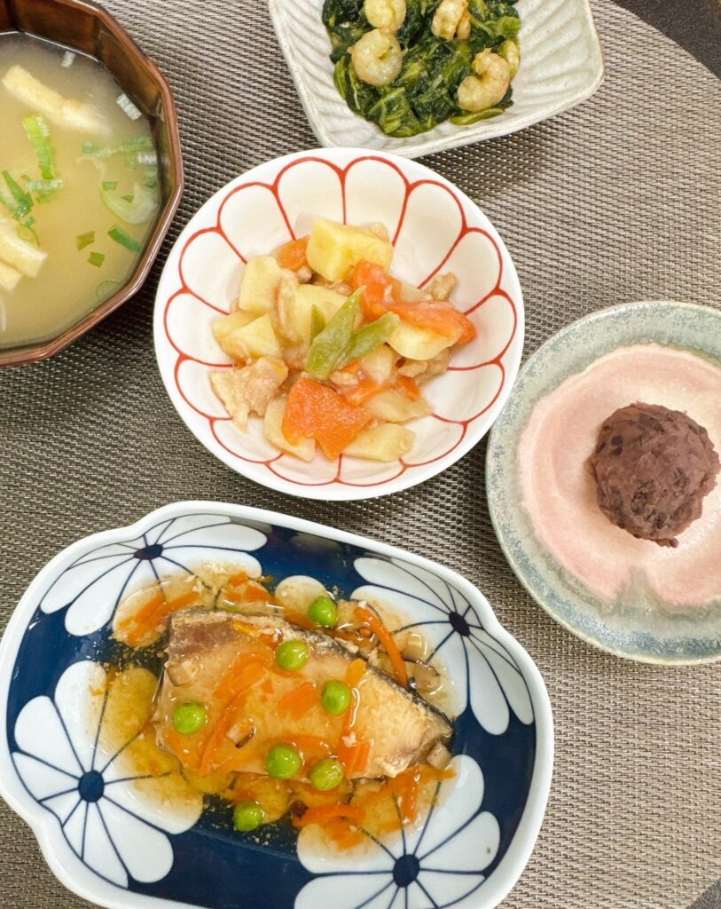 「本日の昼食」 投稿日 2025年9月23日 著者 ほっとキッチン カテゴリー お知らせ・ブログ 2025.9.23(火) 〈昼食〉〇味噌汁(玉ねぎ・油揚げ・こねぎ)〇ぶりの野菜あんかけ〇じゃが芋と鶏肉の煮物〇ほうれん草とえびの和え物〇ミニおはぎ 本日の献立はお彼岸のメニューで『おはぎ』がデザートに✨ 秋のお彼岸はご先祖様への日頃の感謝をの気持ちを込める他にも、 一年の収穫を喜び、自然の恵みに感謝する意味合いがあるそうです😌 本日の「おはぎ」は、やわらかく、あんこたっぷりで程よい甘さで美味しかったです😋