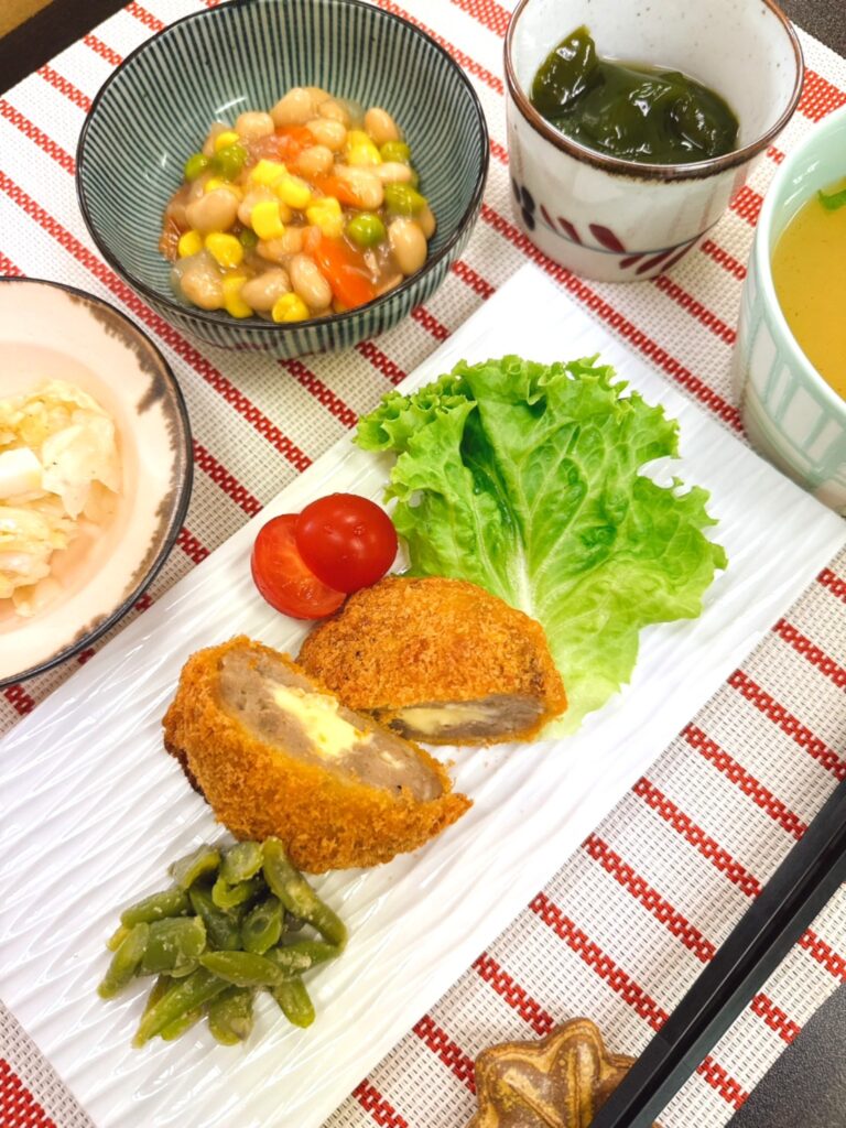「本日の昼食」 投稿日 2025年9月24日 著者 ほっとキッチン カテゴリー お知らせ・ブログ 2025.9.24(水) 〈昼食〉〇味噌汁(大根、えのき、こねぎ)〇チーズ入りメンチカツ(付:いんげんの胡麻和え)〇大豆のコーン煮〇キャベツといかのサラダ〇抹茶ゼリー チーズ入りメンチカツは外はサクッと、中はチーズがとろ~りとしていて美味しかったです✨大豆のコーン煮はコーンの甘みもあり、やさしいお味でした😊デザートの抹茶ゼリーは抹茶の風味がふわっと香り、さっぱりといただきました🥄 ※付け合わせのレタスとトマトはこちらで準備いたしました🙇♀️