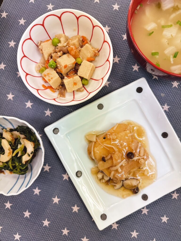 「本日の夕食」 投稿日 2025年9月25日 著者 ほっとキッチン カテゴリー お知らせ・ブログ 2025.9.25(木) 〈夕食〉○味噌汁○チキンのきのこあんかけ○高野豆腐と牛肉の炒り煮○ほうれん草と竹輪の和え物 本日の昼食は『チキンのきのこあんかけ』です✨チキンはとっても柔らかく食べやすかったですよ😊高野豆腐はだしがよく染みて美味しかったです^^