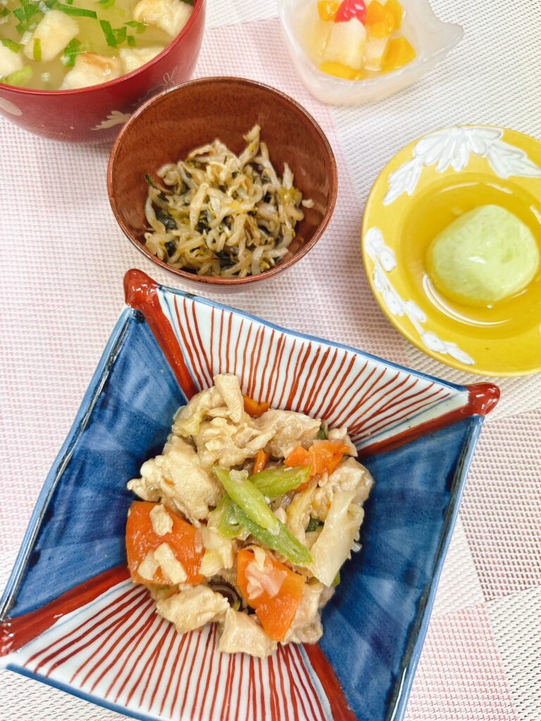 「本日の昼食」 投稿日 2025年9月30日 著者 ほっとキッチン カテゴリー お知らせ・ブログ 2025.9.30(火) 〈昼食〉〇味噌汁〇鶏肉の中華炒め〇枝豆入りしんじょう〇もやしのナムル〇フルーツカクテル 本日の昼食のメインは鶏肉の中華炒めです🎵鶏肉は柔らかく、人参やいんげんの色味もきれいで彩り良かったです😊枝豆入りしんじょうは、あんがたっぷりからんでいて、食べやすい柔らかさでした😋もやしのナムルはもやしの食感がシャキシャキ✨さっぱりした味付けでメインの鶏肉の中華炒めにぴったりの副菜です☻