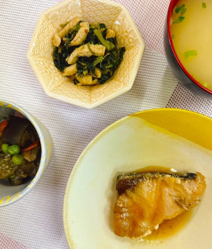 「本日の夕食」 投稿日 2025年10月7日 著者 ほっとキッチン カテゴリー お知らせ・ブログ 2025.10.7(火)〈夕食〉〇味噌汁(大根、わかめ、こねぎ)〇コク旨ぶりの照り焼き〇茄子のピリ辛炒め煮〇ほうれん草のおかか和え 本日の夕食は、ぶりの照り焼きでした🐟甘めの照り焼きのタレがよく絡み、ぶりの身もしっとりしていて食べやすかったです☻ほうれん草と油揚げのおかか和えは、お出汁がしみた油揚げがジューシーで食べ応えがありました😋