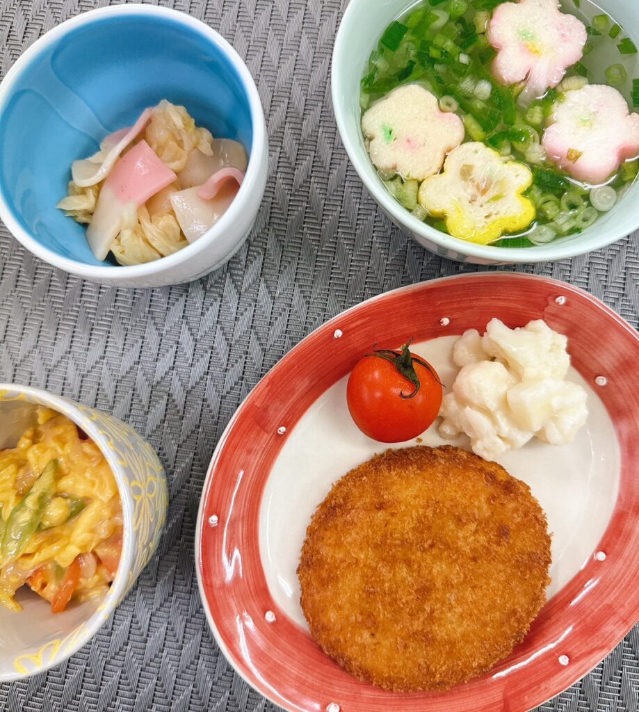 「本日の夕食」 投稿日 2025年10月8日 著者 ほっとキッチン カテゴリー お知らせ・ブログ 2025.10.8(水) 〈夕食〉○清汁(花麩、玉ねぎ、こねぎ)○サクホク肉コロッケ(付け合わせ:カリフラワー)○ツナ入り炒り卵○キャベツと蒲鉾の和え物🆕 本日の夕食は『サクホク肉コロッケ』です🥔大きくとってもボリュームがありました😊新メニューの『キャベツと蒲鉾の和え物』はシャキシャキとしたキャベツの食感がよく、美味しかったです^^