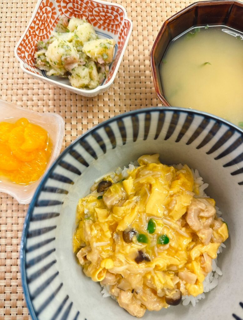 「本日の昼食」 投稿日 2025年10月10日 著者 ほっとキッチン カテゴリー お知らせ・ブログ 2025.10.10(金)〈昼食〉〇味噌汁(葉大根、油揚げ)〇秋の味覚3種のきのこ親子丼〈新メニュー✨〉〇じゃが芋ののり塩炒め〇みかんのシロップ漬け 本日の昼食は 爽やかな秋が感じられる「秋の味覚3種のきのこ親子丼」です✨🍁椎茸、えのき、しめじの3種類のきのこを使用しております😊食感が楽しく 食物繊維もしっかりと取れる1品になっていますので、もりもり食べて元気をつけていきましょう♪