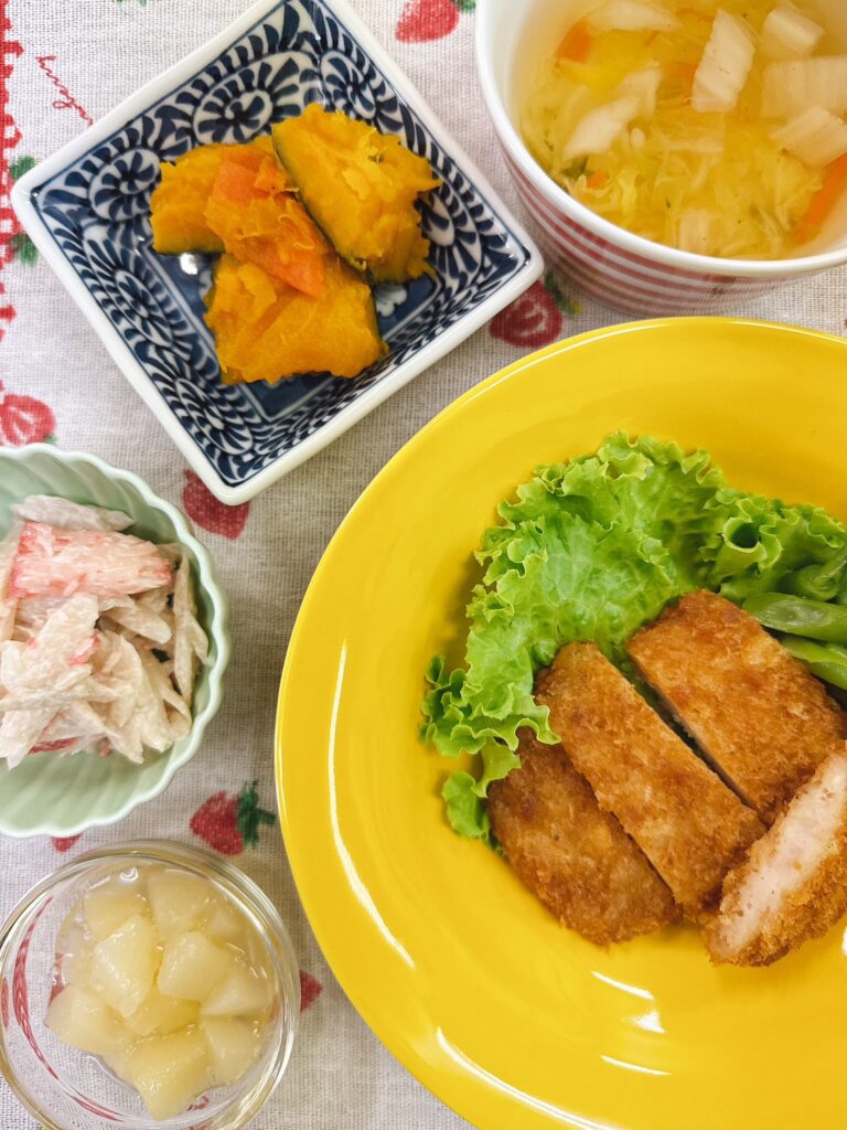 「本日の昼食」 投稿日 2025年10月11日 著者 ほっとキッチン カテゴリー お知らせ・ブログ 2025.10.11(土) 〈夕食〉○コンソメスープ(白菜、人参、パセリ)○とんかつ(付け合わせ)いんげんの和え物○かぼちゃのカレー風味煮○ごぼうとかにかまのサラダ○白桃🍑 本日の昼食は『とんかつ』です🐖身が柔らかく、食べやすかったですよ◎副菜の『ごぼうとかにかまのサラダ』は、かにかまの味がよく出ていて美味しかったです😊