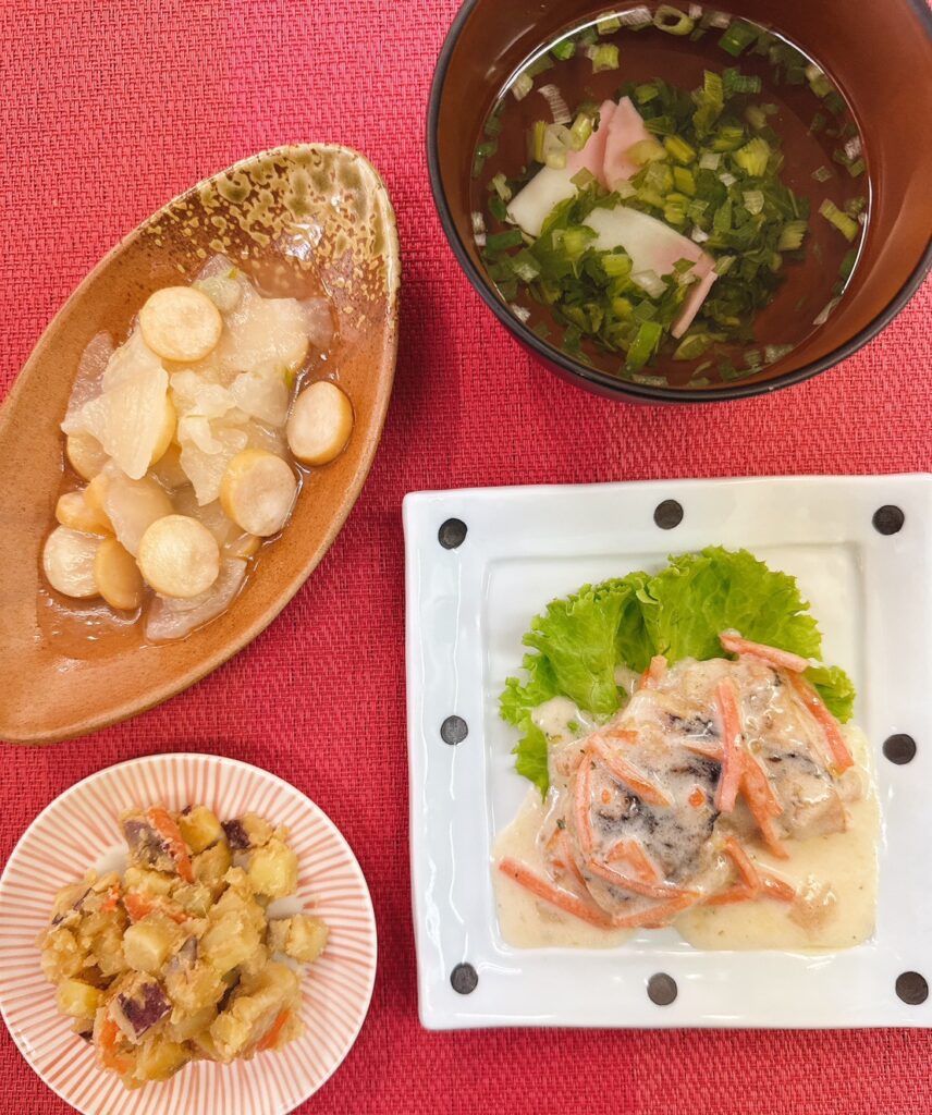 「本日の夕食」 投稿日 2025年10月12日 著者 ほっとキッチン カテゴリー お知らせ・ブログ 2025.10.12(日) 〈夕食〉○清汁(葉大根、蒲鉾)○チキンのクリーム煮○大根とウインナーのコンソメ煮○さつま芋のピーナツバター和え 本日の夕食は『チキンのクリーム煮』です✨レモン風味のチキンはとっても柔らかかったです◎🍋クリームとの相性も良く、とっても美味しかったです😊