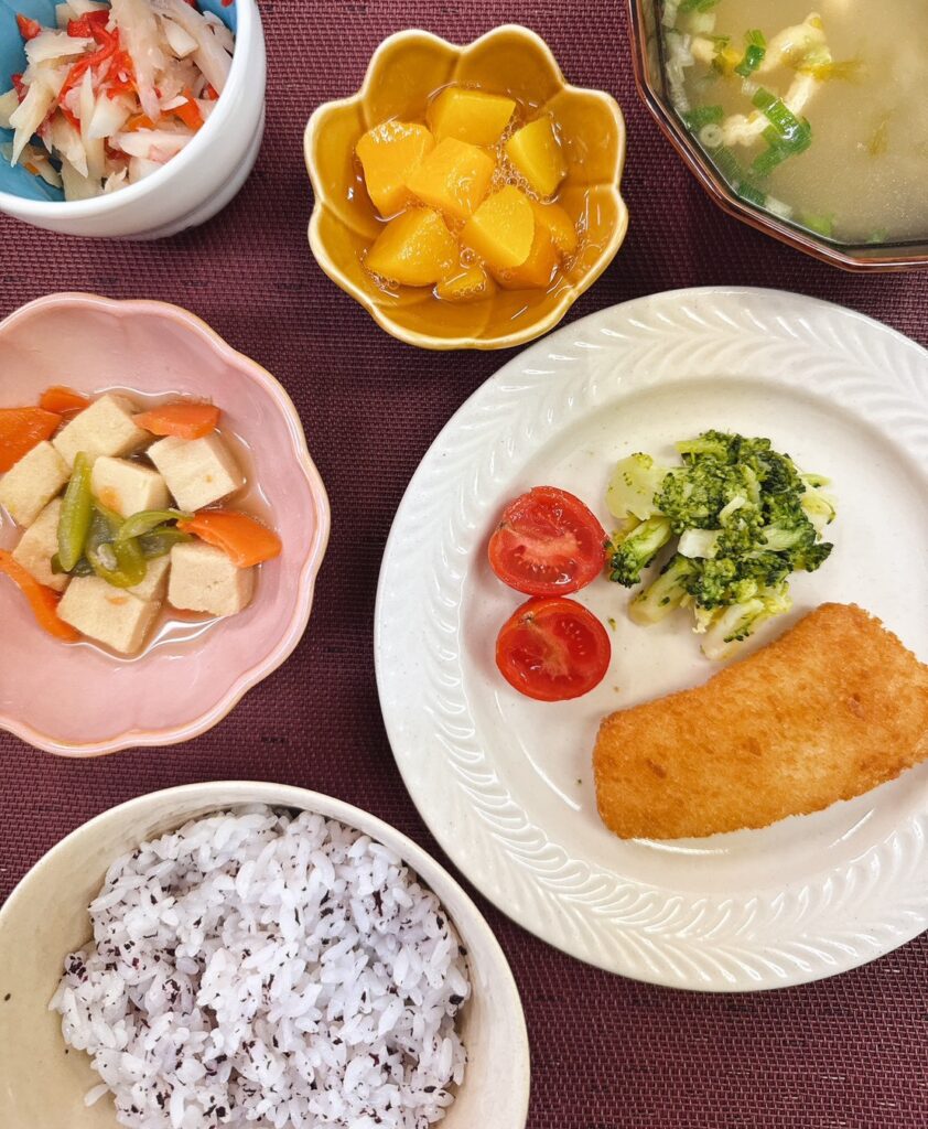 「本日の昼食」 投稿日 2025年10月13日 著者 ほっとキッチン カテゴリー お知らせ・ブログ 2025.10.13(月) 〈昼食〉○味噌汁(油揚げ、あおさ、こねぎ)○ゆかりご飯○プリっとえびカツ(付け合わせ:ブロッコリー)○高野豆腐の炒り煮○ごぼうの甘酢和え○黄桃 本日の昼食は『プリっとえびカツ』です🦐えびの風味たっぷりで美味しかったです✨『ごぼうの甘酢和え』は柔らかく、さっぱりしていました😊