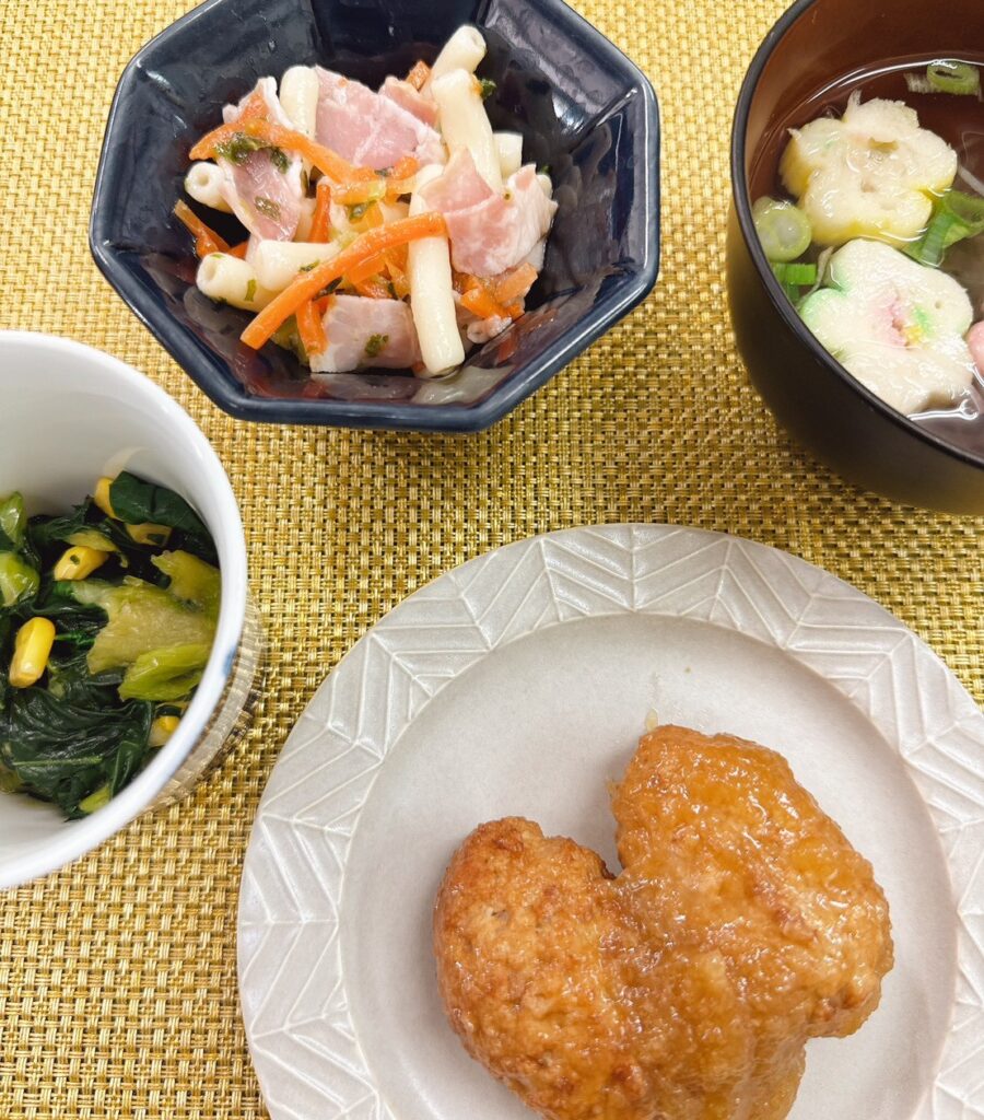 「本日の夕食」 投稿日 2025年10月22日 著者 ほっとキッチン カテゴリー お知らせ・ブログ 2025.10.22(水) 〈夕食〉○清汁(玉ねぎ、花麩、こねぎ)○蓮根入りつくねのおろしソース○マカロニのコンソメ炒め煮○青梗菜とコーンの和え物 本日の夕食は『蓮根入りつくねのおろしソース』です^^シャキシャキ食感の蓮根がたっぷりでとっても美味しかったです😊副菜の青梗菜の彩りもよかったです🥬✨
