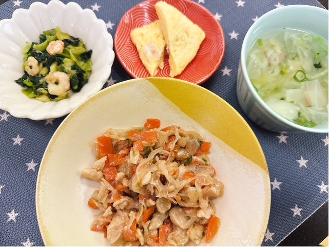 「本日の夕食」 投稿日 2025年10月24日 著者 ほっとキッチン カテゴリー お知らせ・ブログ 2025.10.24(金) 〈夕食〉○清汁(キャベツ、蒲鉾、こねぎ)○鶏肉のプルコギ風○ベーコンエッグ(新メニュー✨)○青梗菜とえびの和え物 『鶏肉のプルコギ風』は辛さもちょうどよく、食べやすかったです😊『ベーコンエッグ』は卵とベーコンの相性がよく美味しかったです✨