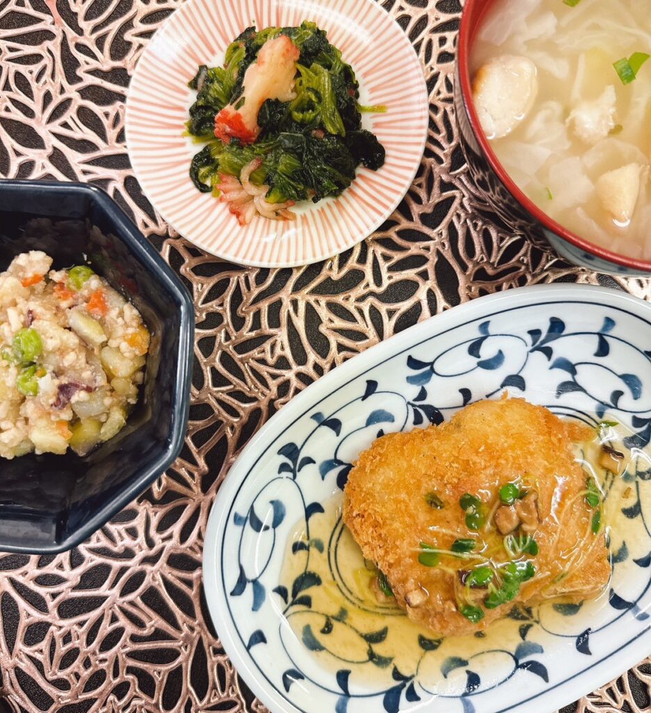「本日の夕食」 投稿日 2025年10月30日 著者 ほっとキッチン カテゴリー お知らせ・ブログ 2025.10.30(木) 〈夕食〉〇味噌汁(おつゆ麩、大根、こねぎ)〇タラカツの生姜あんかけ〇さつま芋と鶏そぼろの炒め煮〇ほうれん草とかにかまの和え物 本日の夕食は『タラカツの生姜あんかけ』です✨タラカツはふわっと柔らかく、生姜風味のあんが美味しかったです😊『ほうれん草とかにかまの和え物』はかにの風味がよくでていました^^