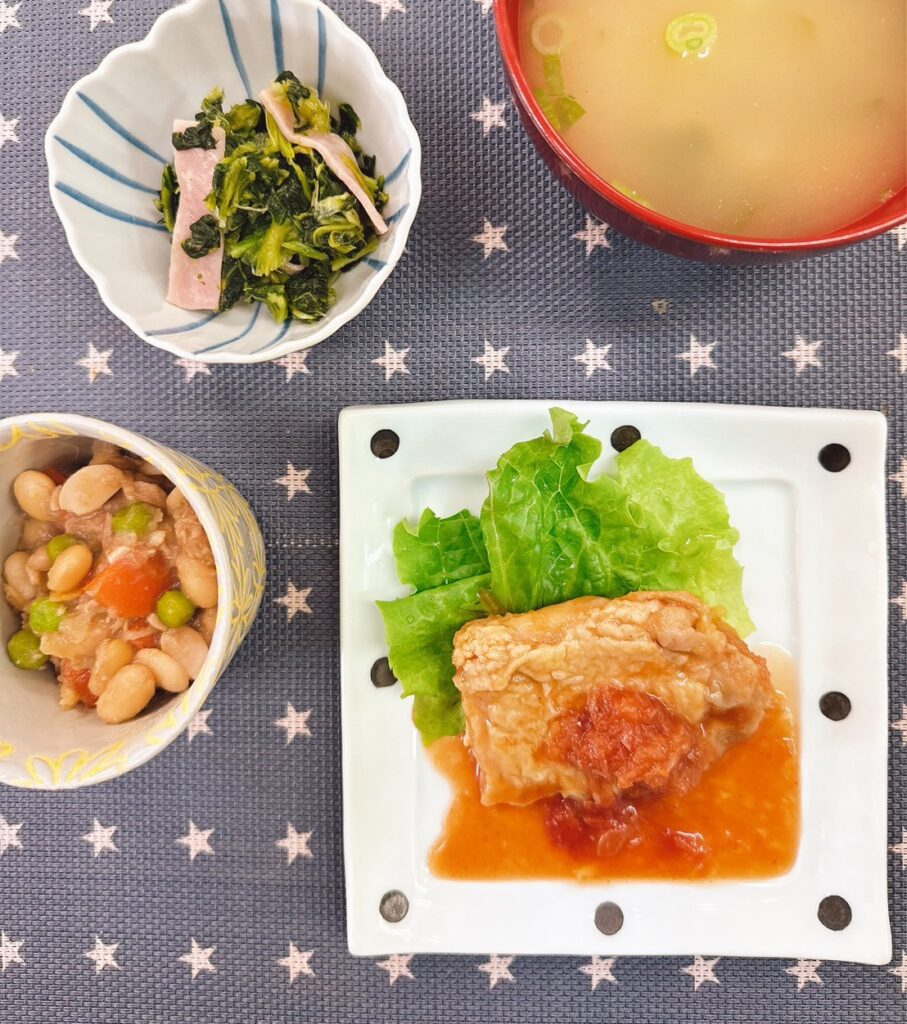 「本日の夕食」 投稿日 2025年10月31日 著者 ほっとキッチン カテゴリー お知らせ・ブログ 2025.10.31(金) 〈夕食〉〇味噌汁(わかめ、竹輪、こねぎ)〇チキンのトマトソースかけ〇大豆とツナの煮物〇しろ菜とハムの和え物 本日の夕食は『チキンのトマトソースかけ』です🍅チキンはとても柔らかく、さっぱり味のトマトソースが美味しかったです😊