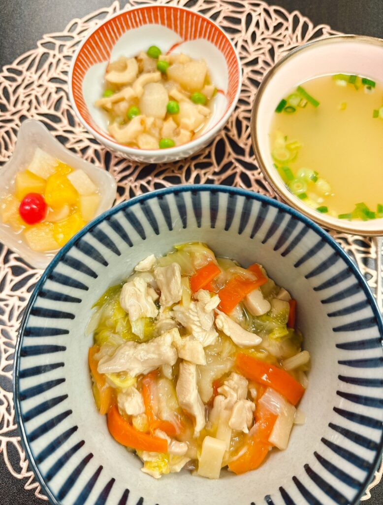 「本日の昼食」 投稿日 2025年11月12日 著者 ほっとキッチン カテゴリー お知らせ・ブログ 2025.11.12(水)〈昼食〉〇味噌汁(あおさ、なめこ、こねぎ)〇鶏の中華あんかけ丼(新メニュー✨)〇かぶと竹輪の煮物〇フルーツカクテル 『鶏の中華あんかけ丼』は、鶏肉に白菜、たけのこ、人参…など、具だくさんで食べ応えがありました!😊とろみがしっかりとついていて、おいしかったです✨