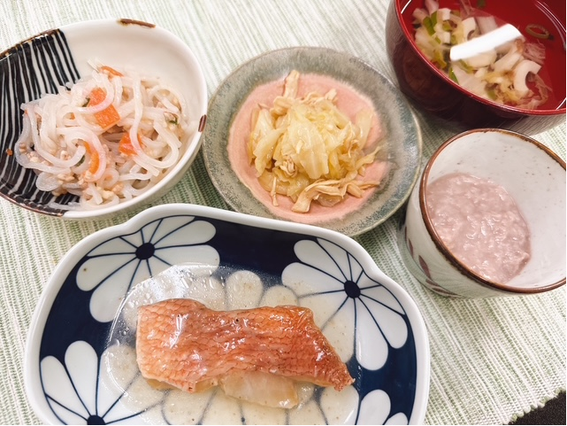「本日の昼食」 投稿日 2025年11月13日 著者 ほっとキッチン カテゴリー お知らせ・ブログ 2025.11.13(木) 〈昼食〉〇清汁(白菜、竹輪、こねぎ)〇赤魚のレモンソースかけ〇マロニーの中華煮〇キャベツと蒸し鶏の青じそサラダ〇あずき豆乳プリン 「マロニーの中華煮」は、マロニーにだしの味がしみていました✨「あずき豆乳プリン」は、小豆の風味良く優しい甘さで美味しかった😊🫘