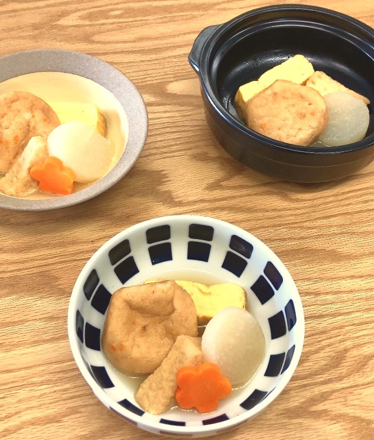具材をあれこれと検討し、具材によってだし汁の濃さを調整するなど様々な試行錯誤を重ね、栄養士・製造チーム一丸となっておでんを完成させました💪