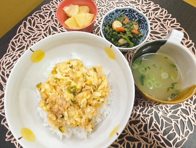「本日の昼食」 投稿日 2025年12月4日 著者 ほっとキッチン カテゴリー お知らせ・ブログ 2025.12.4(木) 〈昼食〉〇味噌汁(葉大根、椎茸)〇たぬき丼〇ほうれん草とウインナーのソテー〇パイン 『たぬき丼』は、出汁がしみ込んだ天かすを卵がふんわりと包んでいて美味しかったです✨ 『ほうれん草とウインナーのソテー』はしっかりとした味付けで、ほうれん草は軟らかくて食べやすかったです😊