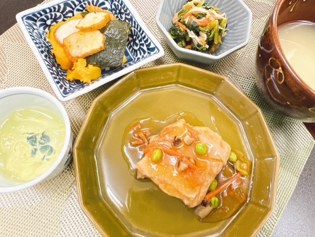 「本日の昼食」 投稿日 2025年12月22日 著者 ほっとキッチン カテゴリー お知らせ・ブログ 2025.12.22(月) 〈昼食〉〇味噌汁(キャベツ、わかめ、こねぎ)〇チキンの五目あんかけ〇ホクホク南瓜とさつま揚げの煮物〇法蓮草とえのきのおかか和え〇柚子ゼリー 『チキンの五目あんかけ』は、チキンが軟らかくて食べやすかったです😊 『柚子ゼリー』は、柚子の香りがふわっと広がり、後味さっぱりで美味しかったです✨