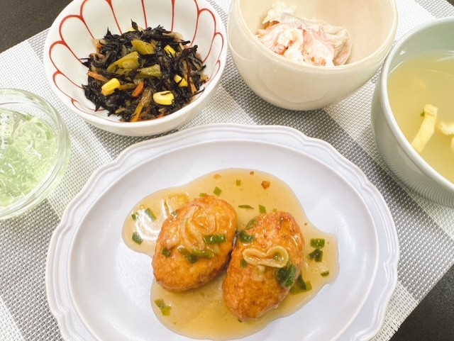 「本日の昼食」 投稿日 2026年1月2日 著者 ほっとキッチン カテゴリー お知らせ・ブログ 2026.1.2(金) 〈昼食〉〇味噌汁(葉大根、油揚げ)〇蓮根入りつくねのねぎソース〇ひじき煮〇ごぼうのカニマヨサラダ〇青りんごゼリー 『蓮根入りつくねのねぎソース』は、ねぎソースがつくねによく絡んで美味しかったです😊 『ひじき煮』は、ひじきの旨みに、コーンの甘みがよくなじんでいました🌽
