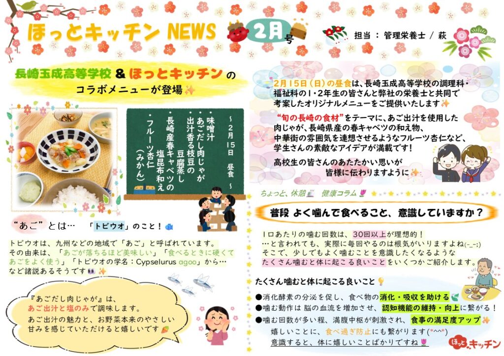 「ほっとキッチンNEWS ~2月号~」 投稿日 2026年2月1日 著者 ほっとキッチン カテゴリー お知らせ・ブログ ほっとキッチンNEWS 2月号のご紹介です⛄ 管理栄養士の萩が作成いたしました✨ 〇長崎玉成高等学校&ほっとキッチンのコラボメニューが登場✨ 〇“あご”とは・・・「トビウオ」のこと!🐟 〇ちょっと、休憩 健康コラム「普段、よく噛んで食べること、意識していますか?」🥢 まだまだ寒い時期が続きますが、体調を崩されないようお気をつけください😌