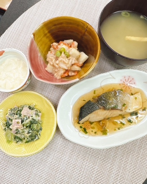 「本日の昼食」 投稿日 2026年2月25日 著者 ほっとキッチン カテゴリー お知らせ・ブログ 2026.2.25(水) 〈昼食〉〇味噌汁(大根、油揚げ、こねぎ)〇ぶりのねぎソース〇じゃがいものそぼろ煮〇しろ菜とハムのおかかマヨ和え(新メニュー✨)〇豆乳プリン 『ぶりのねぎソース』は、ぶりはふっくらと軟らかく、ねぎソースがよく絡んで美味しかったです🐟 『豆乳プリン』は、やさしい甘さでなめらかな口当たりでした😊