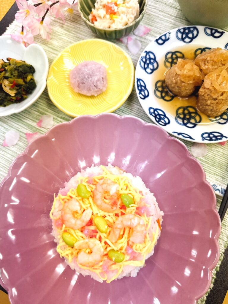 「本日の昼食 🌸ひなまつり🌸」 投稿日 2026年3月3日 著者 ほっとキッチン カテゴリー お知らせ・ブログ 2026.3.3(火) 〈昼食〉〇清汁(花麩、玉ねぎ、こねぎ)〇ちらし寿司〇肉団子の玉ねぎソースかけ〇菜の花とあさりのバター醤油ソテー(新メニュー✨)〇うの花サラダ〇ミニ桜もち 本日の昼食はひなまつり🌸メニューです🎎春を感じていただけるよう、菜の花やあさりなどを使用したメニューもご提供しています🌱『菜の花とあさりのバター醤油ソテー』はバターの風味とあさりの旨味もあり、美味しかったです😊 ※ちらし寿司に添えているえびはこちらで準備しております🙇♀️