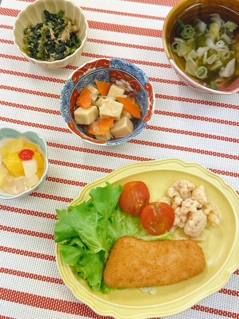 「本日の昼食」 投稿日 2026年3月5日 著者 ほっとキッチン カテゴリー お知らせ・ブログ 2026.3.5(木) 〈昼食〉〇清汁(キャベツ、あおさ、こねぎ)〇えびカツ(付)カリフラワー〇高野豆腐とニラの炒り煮〇ほうれん草とツナ和え〇フルーツミックス 『高野豆腐とニラの炒り煮』は、出汁をたっぷり含んだ高野豆腐はじゅわっとやわらかく、ごま油の香りが食欲をそそりました😊 『ほうれん草とツナ和え』は、ほうれん草のほろ苦さに、ツナのコクがよく合い美味しかったです✨ ※付け合わせのレタスはこちらで準備しております🙇♀️