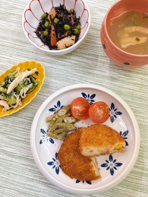 「本日の夕食」 投稿日 2026年3月6日 著者 ほっとキッチン カテゴリー お知らせ・ブログ 2026.3.6(金) 〈夕食〉〇味噌汁(油揚げ、なめこ、こねぎ)〇ホクホク野菜コロッケ(付)いんげんのごまドレ和え〇ひじきといかの炒め煮〇青梗菜と蒸し鶏の辛子和え 本日の夕食は『ホクホク野菜コロッケ』です✨コーンの甘さがアクセントになって、やさしくてほっとする味でした🌽 『青梗菜と蒸し鶏の辛子和え』は、ピリッとした辛子の風味が味を引き締めてくれる一品でした😌 ※付け合わせのトマトはこちらで準備しております🙇♀️