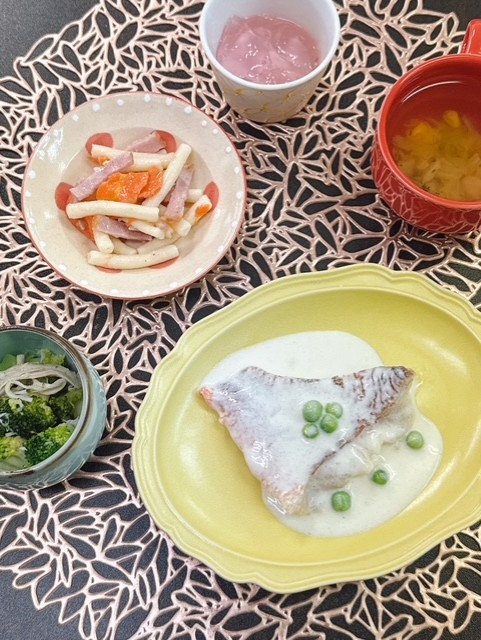「本日の昼食」 投稿日 2026年3月13日 著者 ほっとキッチン カテゴリー お知らせ・ブログ 2026.3.13(金) 〈昼食〉〇コンソメスープ(白菜、コーン、パセリ)〇赤魚のクリーム煮〇マカロニとベーコンのペペロン風(新メニュー✨)〇ブロッコリーと蒸し鶏の和え物〇ピーチゼリー 『赤魚のクリーム煮』は、赤魚にまろやかなクリームソースが絡んで美味しかったです✨ 『マカロニとベーコンのペペロン風』は、にんにくの香ばしい香りがふわっと広がり、ピリッとした唐辛子がアクセントになっていました😊
