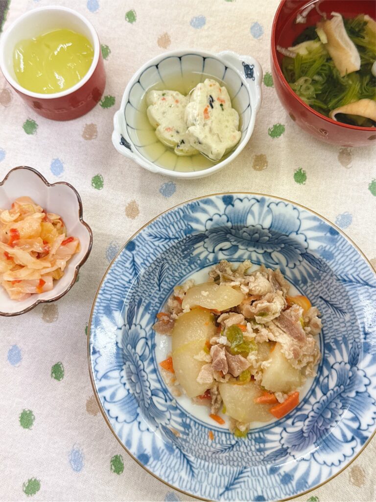 「本日の昼食」 投稿日 2026年3月15日 著者 ほっとキッチン カテゴリー お知らせ・ブログ 2026.3.15(日) 〈昼食〉〇清汁(庄内麩、ほうれん草、こねぎ)〇豚肉と冬瓜の中華炒め〇木の葉しんじょうの煮物〇キャベツのトマトドレッシング和え〇マスカットゼリー 『豚肉と冬瓜の中華炒め』は冬瓜にも味がよく染みており、柔らかくて美味しかったです😊✨ 『キャベツのトマトドレッシング和え』はさっぱりとした酸味で食べやすく、トマトの風味もしっかりありました🍅