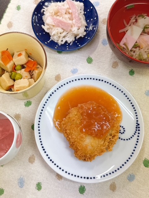 「本日の昼食」 投稿日 2026年3月31日 著者 ほっとキッチン カテゴリー お知らせ・ブログ 2026.3.31(火) 〈昼食〉〇清汁(もやし、蒲鉾、こねぎ)〇タラカツのチリソースかけ〇高野豆腐と昆布の炒り煮〇切干大根とハムのサラダ〇いちごゼリー 『タラカツのチリソースかけ』はマイルドな辛さのチリソースがタラカツに絡んで美味しかったです🌶️ 『高野豆腐と昆布の炒り煮』は昆布の旨みが広がり、ほっとする味わいでした😌