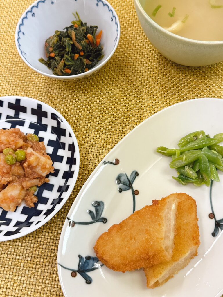 「本日の夕食」 投稿日 2026年4月7日 著者 ほっとキッチン カテゴリー お知らせ・ブログ 2026.4.7(火) 〈夕食〉〇味噌汁(玉ねぎ、油揚げ、こねぎ)〇ささみチーズカツ(付)いんげんのソテー〇じゃがいものボロネーゼ〇ほうれん草の黒ごま和え 「ささみチーズカツ」は衣はサクサクで中はしっとりやわらかく、チーズのコクがよく合い美味しかったです🎵 「ほうれん草の黒ごま和え」は新メニュー✨黒ごまの風味がしっかりありました‼