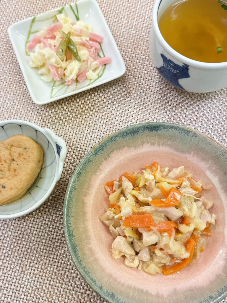 「本日の夕食」 投稿日 2026年4月11日 著者 ほっとキッチン カテゴリー お知らせ・ブログ 2026.4.11(土)〈夕食〉〇中華スープ(錦糸卵、にら)〇鶏肉とキャベツの回鍋肉風〇がんもの含め煮〇冷)大根と蒲鉾の生姜ドレ和え 本日の夕食は炒め物メニューです✨鶏とキャベツの回鍋肉風は、味噌のコクを活かしつつも、味付けも食材もやわらかく仕上げた1品です(*^^*)副菜のがんもの含め煮はだしの旨みをしっかり含ませ、じゅわ~っと食感をお楽しみいただけます😋