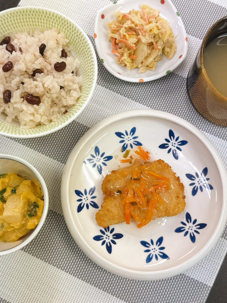 「本日の夕食」 投稿日 2026年4月15日 著者 ほっとキッチン カテゴリー お知らせ・ブログ 2026.4.15(水)〈夕食〉〇味噌汁(玉ねぎ、油揚げ、こねぎ)〇お赤飯〇チキンカツの甘酢あん (別袋)あん〇ニラ玉高野豆腐〇キャベツの練りごま和え 本日の夕食は「お赤飯」です‼ふっくらとした食感で程よい塩味があり、飽きずに美味しくいただけました✨「チキンカツの甘酢あん」はサクッとしたチキンカツに甘酢あんがよく絡み、程よい酸味で食べやすい仕上がりになっています😊