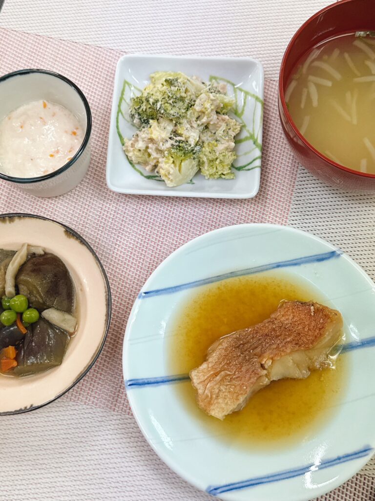 「本日の昼食」 投稿日 2026年4月16日 著者 ほっとキッチン カテゴリー お知らせ・ブログ 2026.4.16(木)〈昼食〉〇味噌汁(もやし、わかめ、こねぎ)〇赤魚の煮つけ〇なすとしめじの炒め物〇ブロッコリーのツナマヨ和え〇フルーチェ(オレンジ) 「赤魚の煮つけ」は、身がふっくら柔らかく、だしもよく染みていました✨ 「なすとしめじの炒め物」は、しめじの旨味がなすとマッチしていてごはんが進む味です😋