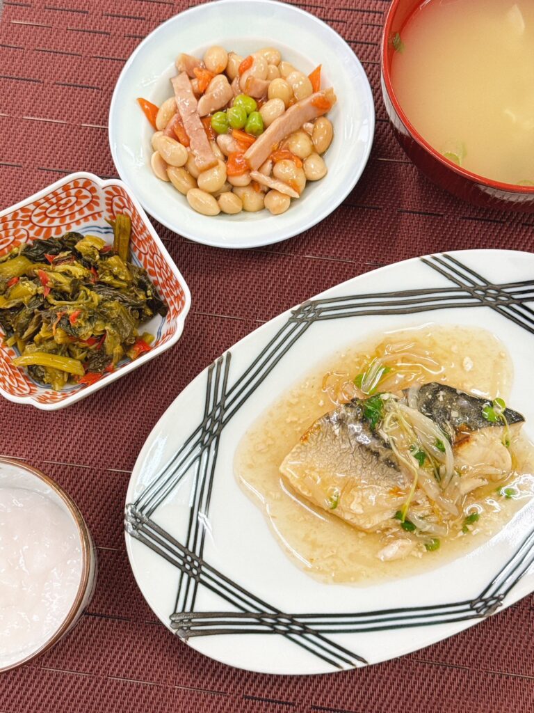 「本日の昼食」 投稿日 2026年4月20日 著者 ほっとキッチン カテゴリー お知らせ・ブログ 2026.4.20(月)〈昼食〉〇味噌汁(キャベツ、竹輪、こねぎ)〇さばの和風もやしあん〇大豆とベーコンの炒め物〇菜の花の甘酢和え〇フルーチェ(ピーチ) 「さばの和風もやしあん」は、脂ののったさばに、さっぱりした和風あんともやしの食感が合って食べやすかったです😊 「菜の花の甘酢和え」は、新メニューです❕甘酢が菜の花の味を引き立てており、春らしく後味さっぱりといただけます✨