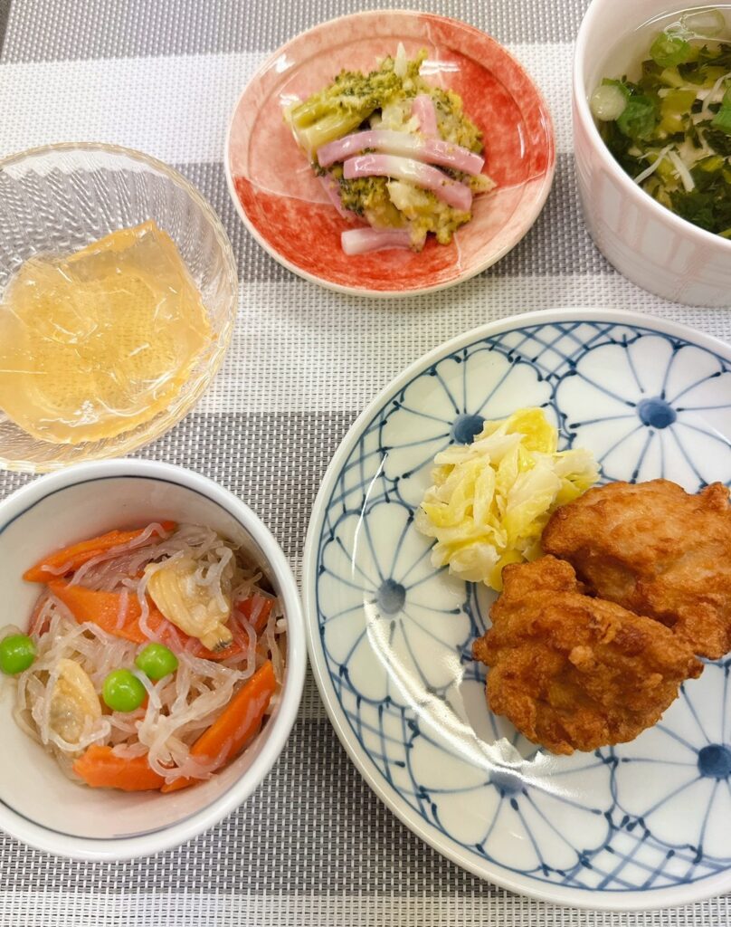 「本日の昼食」 投稿日 2026年4月21日 著者 ほっとキッチン カテゴリー お知らせ・ブログ 2026.4.21(火)〈昼食〉〇若鶏唐揚げ (付)キャベツ〇春雨とあさりの甘辛炒め〇ブロッコリーと蒲鉾のわさび和え〇オレンジゼリー 本日の昼食は『唐揚げ』です😋味がしっかりついてジューシーな唐揚げはご飯がすすみます🤗🍚『春雨とあさりの甘辛炒め』はあさりの風味がしておいしい一品です(^^♪